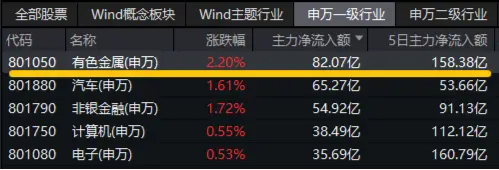 资金面上,截至发稿,有色金属板块获主力资金净流入82.07亿元,高居31个申万一级行业首位!