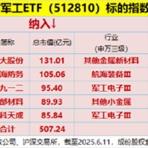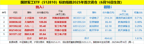 根据中证指数公司官网,国防军工ETF(512810)标的指数中证军工指数拟生效样本已出炉,将于6月16日(下周一)起正式生效,“512810”将跟随指数同步调仓换股。