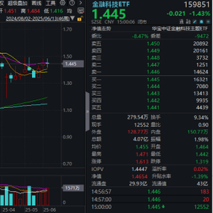 科技题材下挫,金融科技ETF(159851)收跌1.43%,楚天龙逼近跌停!下周能否重拾升势?