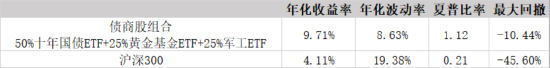 可以看到,债商股组合走势明显较为平稳,此外,年化收益率、年化波动率、夏普比率、最大回撤等指标均优于沪深300指数。