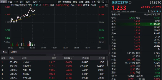 表征国防军工整体走势的国防军工ETF(512810)持续拉升涨超1%,实时成交突破4100万元。成份股方面,长城军工涨停!2400亿市值中航成飞一度飙升逾9%,内蒙一机、中无人机大幅跟涨。