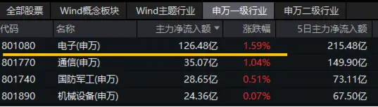 资金面上,电子板块获主力资金净流入126.48万元,霸居31个申万一级行业首位!