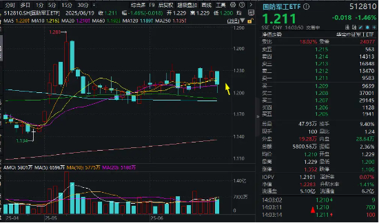 行业代表性国防军工ETF(512810)午后下2.36%一度失守5日、10日、20日等3根均线截至发稿跌幅收窄至1.46%,成交5800万元。
