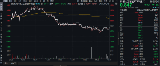 或受中东局势影响,今日(6月19日)A股三大指数悉数收跌,重点布局国产AI产业链的科创人工智能ETF华宝(589520)早盘活跃,场内价格盘中涨逾1.3%,午后被大盘拖拽,最终收跌0.12%。