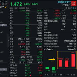 热门ETF方面,金融科技ETF(159851)场内价格下挫3%,失守5日、10日均线,环比缩量成交5.25亿元。资金面上,受益于近期“事件+政策”双驱动,金融科技ETF(159851)近三日累计获3.9亿元资金加仓,或表明资金对板块中长期趋势的乐观态度。
