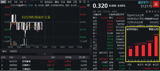 以医疗ETF512170)为例,数据显示,场内价格五连跌之际,资金连续申赎净流入,且金额逐日增加,619日单日高达2.2亿元,近5日累计吸金合计6.85亿元