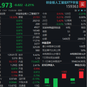 热门ETF方面,同标的指数规模较大、流动性较好的创业板人工智能ETF华宝(159363)场内收跌2.21%,失守5日、10日均线,全天成交1.26亿元。盘中频现溢价交易,显示买盘活跃,资金全天净申购2600万份。