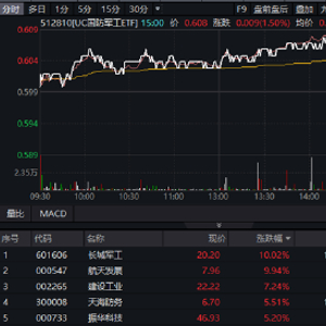 值得一提的是,今日是国防军工ETF(512810)份额拆分后的首个交易日,交易门槛(一手价格)由拆分前的120元左右,降至60元左右,为同类最低,交易便利性大幅提升。
