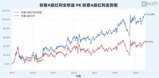 这里要做一个小科普,我们一般谈及的指数,比如中证 A500,都是传统上的价格指数,因为派息要除权,所以它并不反映股息相关的收益。也正因此,指数公司会推出对应的全收益指数,比如中证 A500 全收益指数,来体现股息和股息再投资的收益(全收益指数不考虑税收因素)。而全收益指数,一般被认为更能体现投资者长期持有高股息资产的投资收益。