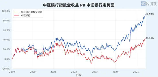 从下表可以看到,之前很多年里面中证银行表现都相当惨淡,尤其是 2020 年这样的 A股大牛市竟然算上股息都还是负收益。但到了 2024 年,价格指数和股息再投资双双发力,大出风头。