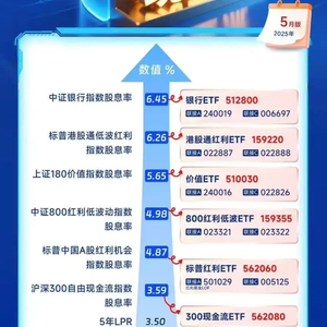 注:全收益指数将成份股分红计入收益。A500ETF华宝标的指数为中证A500,其基日为2004.12.31,发布于2024.9.23,标的指数(全收益)近5个完整年度(2020-2024)的涨跌幅分别为:33.60%、2.15%、-20.95%、-9.40%、16.06%;300现金流ETF标的指数为沪深300自由现金流指数,基日为2013.12.31,发布日期为2024.11.12,标的指数(全收益)近5个完整年度(2020-2024)的涨跌幅分别为:16.20%、13.83%、-4.31%、12.94%、40.79%;标普红利ETF标的指数为标普中国A股红利机会指数,基日为2004.6.21,发布日期为2008.9.11,标的指数(全收益)近5个完整年度(2020-2024)的涨跌幅分别为:6.12%、23.12%、-3.59%、14.21%、14.98%;800红利低波ETF标的指数为中证800红利低波动指数,基日为2013.12.31,发布日期为2024.5.21,标的指数(全收益)近5个完整年度(2020-2024)的涨跌幅分别为:4.98%、24.74%、0.01%、13.87%、27.49%;港股通红利ETF标的指数为标普港股通低波红利指数,其基日为2011.1.31,发布日期为2017.2.20,标的指数(全收益)近5个完整年度(2020-2024)的涨跌幅分别为:-19.86%、14.21%、3.47%、5.35%、34.16%;价值ETF标的指数为上证180价值指数,其基日为2002.6.28,发布于2009.1.9,标的指数(全收益)近5个完整年度(2020-2024)的涨跌幅分别为:0.90%、0.47%、-7.23%、0.83%、33.29%;银行ETF标的指数为中证银行指数,其基日为2004.12.31,发布于2013.7.15,标的指数(全收益)近5个完整年度(2020-2024)的涨跌幅分别为:-0.03%、-0.54%、-4.22%、-1.95%、42.90%。上述ETF基金主要投资于标的指数成份股与备选成份股。指数成份股构成根据该指数编制规则适时调整。指数回测数据、基金的过往业绩并不预示其未来表现。