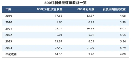 值得注意的是,800 红利低波,因为增加了“低波”因子,所以这些年其实价格表现不俗,2019 -2024 年年化收益为 9.48%,高于同期标普中国A股红利机会指数的 6.49%。相比之下,800 红利低波在股息及再投资上的收益就相对少一点。