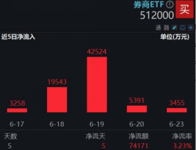 值得一提的是,券商板块近期获资金密集加仓。上交所数据显示,券商ETF(512000)近5日连续吸金,合计达7.42亿元。