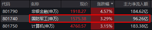 成份股方面,北方导航、长城军工、建设工业、中兵红箭等4股封住涨停板,其中长城军工6天5板,国科军工涨近12%。
