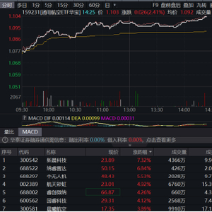 6月25日午后,上证指数持续飙涨创年内新高,非银金融、国防军工领涨!军工航空方向,睿纳雷达涨超6%,新晨科技、中无人机涨超5%,航天彩虹、晨曦航空涨超4%。截至发稿,通用航空ETF华宝(159231)场内价格涨2.41%,价格来到1.103逼近上市以来高点。