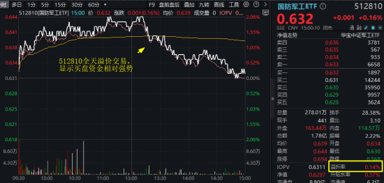 国防军工ETF(512810)场内资金动向印证后市信心。盘中数据显示,512810全天溢价交易,表明买盘资金更为强势,结合成交大幅放量来看,或有巨量资金介入。