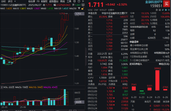 热门ETF方面,金融科技ETF(159851)盘中冲高上涨2%续刷新高,冲击日线五连阳,实时成交额超3.5亿元,交投明显活跃!
