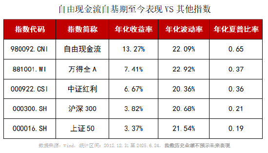 自基期至今(2012年12月31日至2025年6月24日),国证自由现金流指数的年化收益率达到13.27%,显著高于万得全A(7.41%)、中证红利(6.67%)、沪深300(3.82%)、上证50(3.37%)等A股重要指数。尽管其年化波动率(22.09%)略高于部分宽基指数,但其年化夏普比率达到0.65,显著优于其他宽基指数,显示出在承担同等风险的情况下,其长期风险调整后收益更具吸引力。(数据来源:Wind,统计区间:2012.12.31至2025.6.24,指数历史业绩不预示未来表现)