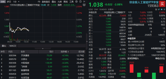 热门ETF方面,同标的指数规模最大、流动性最好的创业板人工智能ETF华宝(159363)场内下探逾2%回踩五日线,实时成交额超6100万元,资金实时净申购1100万份。