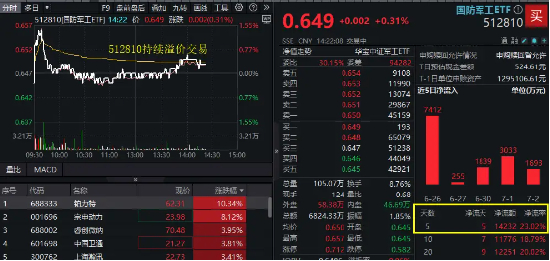 连跌2日后,7月3日,国防军工板块再度活跃,场内高人气国防军工ETF(512810)早盘冲高回落,午后再度翻红,场内溢价又起,买盘资金仍强。此前5个交易日,512810连续吸金合计超1.4亿元。