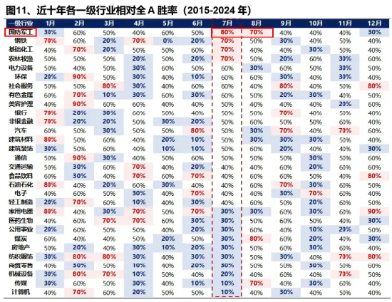近期国防军工反复活跃,人气飙升。兴业证券分析指出,从近十年日历效应看,7月胜率较高的方向主要集中在国防军工、新能源等制造板块,以及钢铁、化工、有色等资源品。