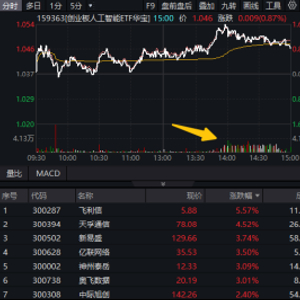 热门ETF方面,同标的指数规模较大、流动性较好的创业板人工智能ETF华宝(159363)午后冲高明显,场内涨幅一度上探1.64%,收盘仍上涨0.87%。值得注意的是,午后159363持续溢价放量交易,全天成交额达1.99亿元,资金大幅净申购9400万份!