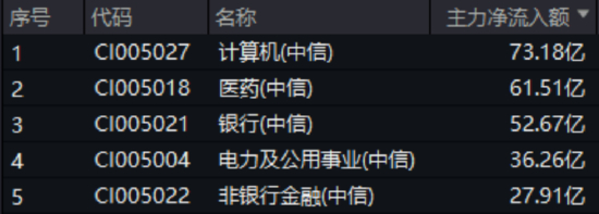 资金面上,主力资金今日大举加码180价值指数权重板块。数据显示,截至今日收盘,银行、电力及公用事业、非银行金融分别以52.67亿元、36.26亿元、27.91亿元的吸金额在30个中信一级行业中分别位居第3、第4、第5。