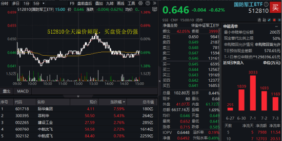 表征国防军工板块整体走势的国防军工ETF(512810)午后一度在中航系助攻下翻红,场内最终收跌0.62%,全天成交6637万元,较上日有所缩量。