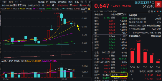 表征板块整体走势的国防军工ETF(512810)顽强收涨,日线十字星,成交5581万元。场内全天频现溢价,显示多头力量仍强,此前7个交易日合计逾1.5亿元连续进场。