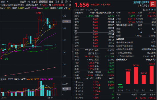 热门ETF方面,金融科技ETF(159851)全天强势表现,场内价格收涨1.47%斩获三连涨!单日成交额达8.89亿元,换手率超13%,交投延续火热!资金近期连续借道ETF布局金融科技机遇,例如金融科技ETF(159851)上周累计吸金达8.8亿元!
