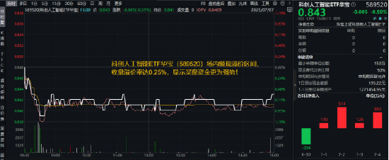 今日(7月7日)重点布局国产AI产业链的科创人工智能ETF华宝(589520)随市盘整,场内价格收跌0.59%,已回落至所有均线以下,值得注意的是,该ETF场内频现溢价区间,收盘溢价率达0.25%,显示买盘资金更为强势!