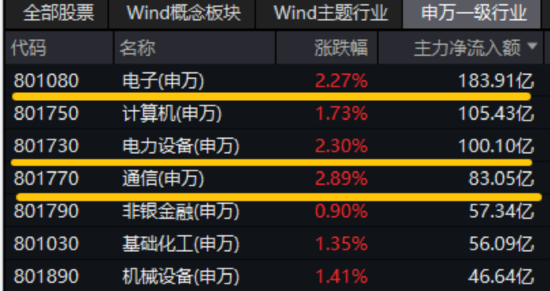 资金面上,超百亿主力资金狂涌!电子、电力设备、通信行业分别获主力资金净流入183.91亿元、100.10亿元、83.05亿元,高居31个申万一级行业第一、第三、第四位!