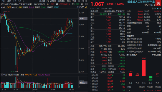 热门ETF方面,同标的指数规模最大、流动性突出的创业板人工智能ETF华宝(159363)全天单边走高,场内价格收涨3.39%,再度站上全部均线。全天成交额达1.6亿元,量能环比激增逾六成!近一周资金频繁加仓创业板人工智能,159363近五日累计吸金超1亿元。