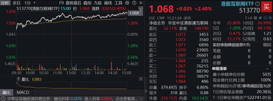 港股同步迎来大涨,科网板块表现亮眼,快手-W涨超5%居前,重仓港股互联网龙头的港股互联网ETF(513770)场内收涨2.4%,成交超4亿元,环比放量82%。