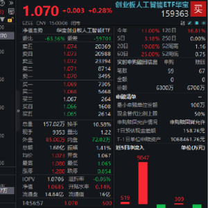 热门ETF方面,同标的指数规模最大、流动性突出的创业板人工智能ETF华宝(159363)全天红盘震荡,场内价格收涨0.28%成功两连阳,再次触及阶段高点。单日成交额达1.68亿元,交投延续高度活跃态势。