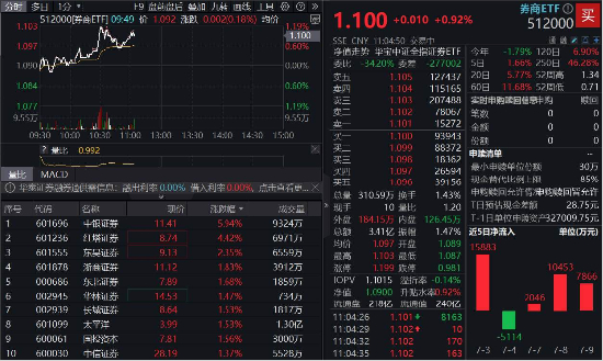 沪指刚突破3500点,“牛市旗手”异动频频。10日早盘,券商突发上冲,中银证券一度涨超9%,现涨近6%,红塔证券绩后涨超4%,东吴证券涨超2%,浙商证券、太平洋、中信证券等涨逾1%。A股顶流券商ETF(512000)场内价格现涨1%,不足半日实时成交额3.4亿元,交投活跃。