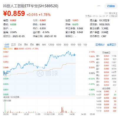 或由于英伟达登顶4万亿市值,“AI 投资热”再升温!今日(7月11日),重点布局国产AI产业链的科创人工智能ETF华宝(589520)午后表现活跃,场内涨幅盘中上探2.13%,现涨1.78%。