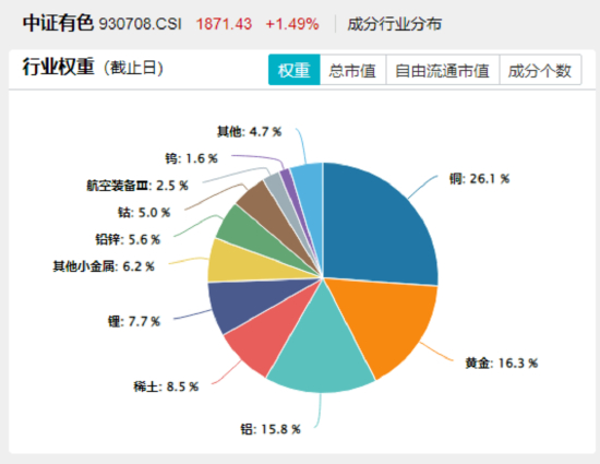 未来产业‘金属心脏’,现代工业‘黄金血液’!按照申万三级行业口径,截至6月底,有色龙头ETF(159876)及其联接基金(A类:017140,C类:017141)被动跟踪的中证有色金属指数中,铜、黄金、铝、稀土、锂行业权重占比分别为26.1%、16.3%、15.8%、8.5%、7.7%,相对于投资单一金属行业,能够起到分散风险的作用,适合作为投资组合的一部分进行配置。