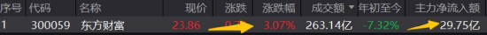 1、“券茅”东方财富全天成交额飙升至263.14亿元,主力狂揽29.75亿元,登顶A股吸金、成交“双冠王”。