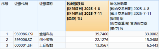 注:统计区间2025.4.8-2025.7.11。中证金融科技主题指数基日为2014.6.30,发布日期为2017.6.22,2020-2024年年度涨跌幅分别为:10.46%、7.16%、-21.40%、10.03%、31.54%。指数成份股构成根据该指数编制规则适时调整,其回测历史业绩不预示指数未来表现。