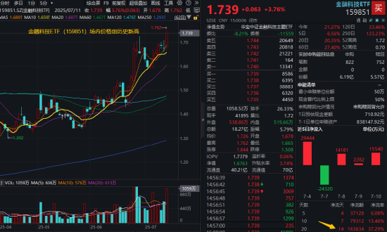 满屏“新高”!牛市旗手领跑,券商ETF放量上探4%!金融科技爆发力MAX,159851盘中暴拉5%