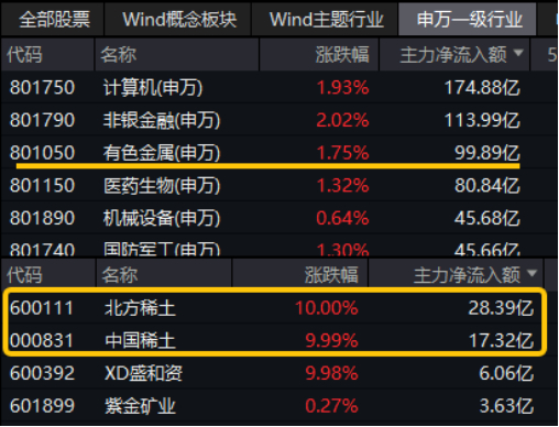 资金面上,有色金属板块全天获主力资金净流入99.89亿元,跻身31个申万一级行业TOP3。北方稀土、中国稀土分别吸金28.39亿元、17.32亿元,高居A股吸金榜第二、第四位。