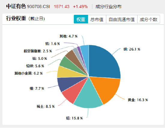 未来产业‘金属心脏’,现代工业‘黄金血液’!按照申万三级行业口径,截至6月底,有色龙头ETF(159876)及其联接基金(A类:017140,C类:017141)被动跟踪的中证有色金属指数中,铜、黄金、铝、稀土、锂行业权重占比分别为26.1%、16.3%、15.8%、8.5%、7.7%,相对于投资单一金属行业,能够起到分散风险的作用,适合作为投资组合的一部分进行配置。