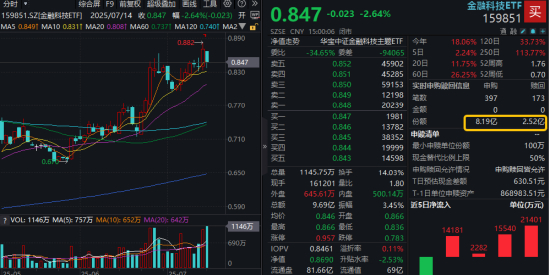热门ETF方面,规模、流动性同类断层第一的金融科技ETF(159851)全天走弱,场内一度下探近4%,收盘跌幅缩窄至2.64%下穿五日线。交投方面,受份额拆分降低交易门槛事件影响,159851全天成交额超9亿元,在市场整体缩量下交投情绪仍相对高涨。金融科技行情深度回调之际资金逆行重仓买入,全天净申购5.67亿份。