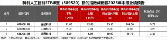 基本面上,截至7月11日,科创人工智能ETF华宝(589520)标的指数30只成份股中已有3只披露业绩预告。澜起科技、乐鑫科技、道通科技预计盈利+预计增长,澜起科技预计归母净利最高实现翻倍增长!