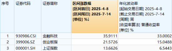 注:统计区间2025.4.8-2025.7.14。中证金融科技主题指数基日为2014.6.30,发布日期为2017.6.22,2020-2024年年度涨跌幅分别为:10.46%、7.16%、-21.40%、10.03%、31.54%。指数成份股构成根据该指数编制规则适时调整,其回测历史业绩不预示指数未来表现。