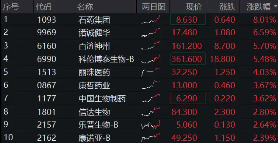 板块个股大面积飘红,截至发稿,石药集团、诺诚建华涨超7%,百济神州涨超6%,科伦博泰生物-B涨超5%,中国生物制药、丽珠医药涨超4%,康方生物涨超3%,再创历史新高。