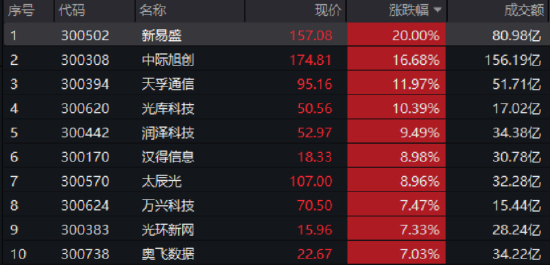 成份股方面,光模块三剑客领衔大涨!新易盛20CM涨停,股价再创新高,中际旭创涨超16%,天孚通信涨近12%。