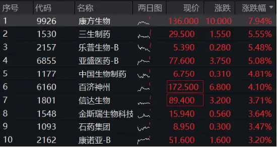 板块个股集体上行,康方生物领涨8%连续刷新历史新高,三生制药、乐普生物-B、亚盛医药-B涨超5%,中国生物制药、百济神州涨超4%。