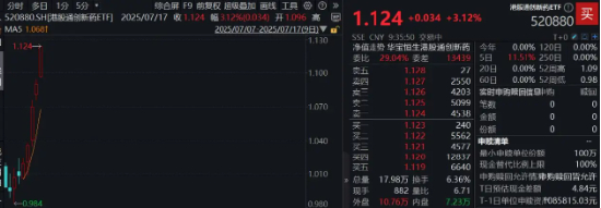 7月17日,港股创新药延续攻势,高纯度+高弹性标的港股通创新药ETF(520880)场内价格涨逾3.12%,冲击日线5连阳,以突出表现摘得全市场ETF实时涨幅榜第一。